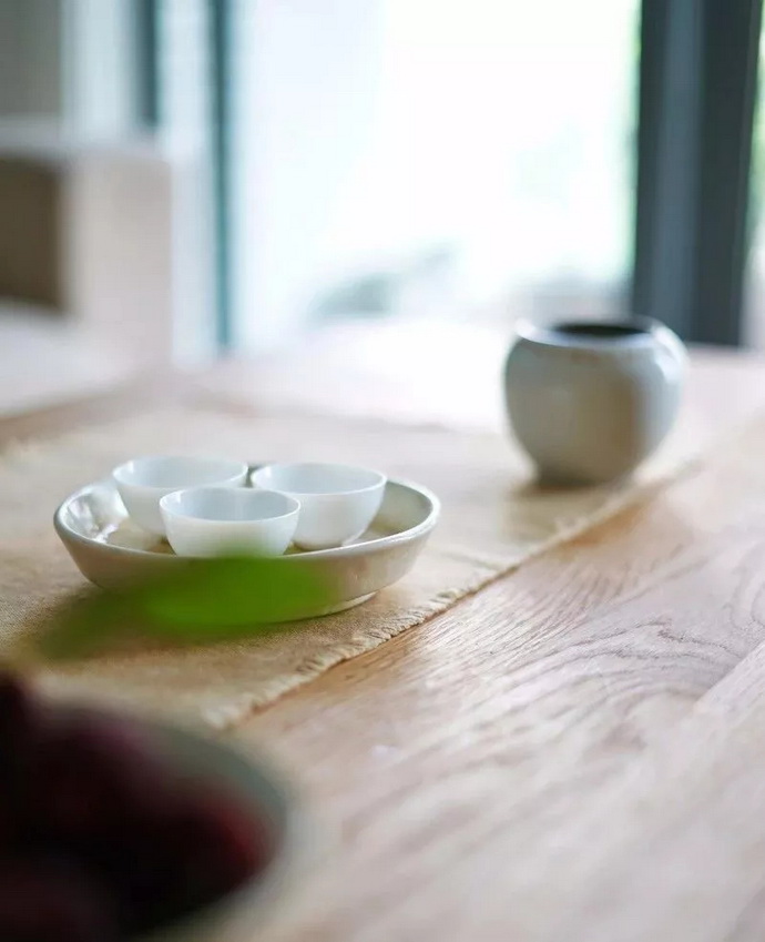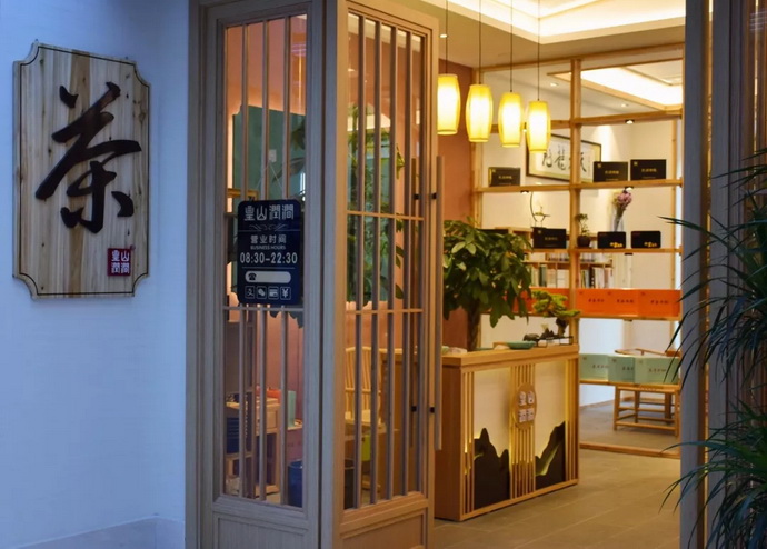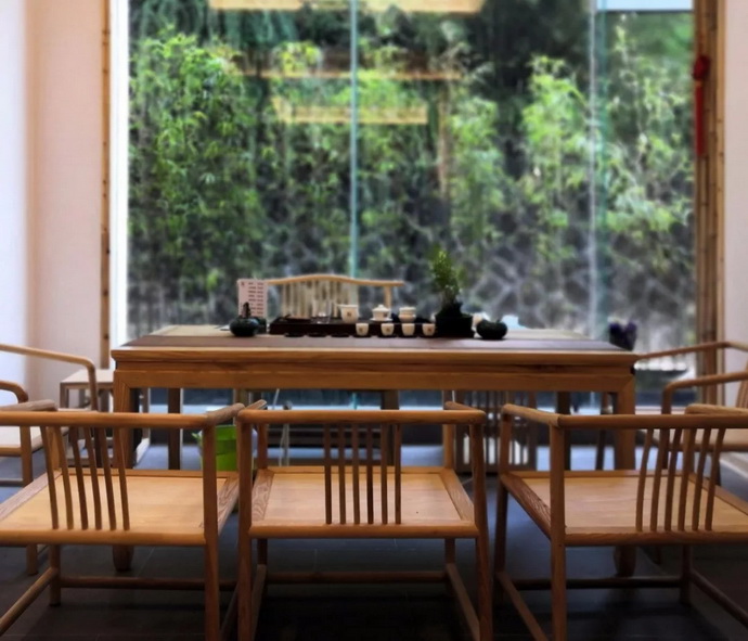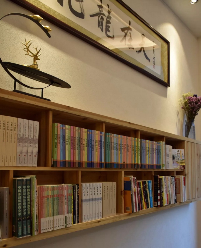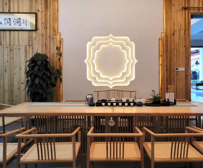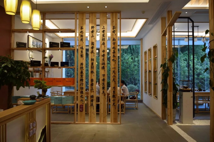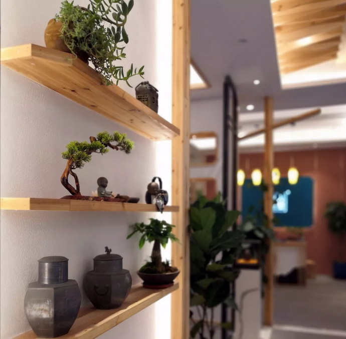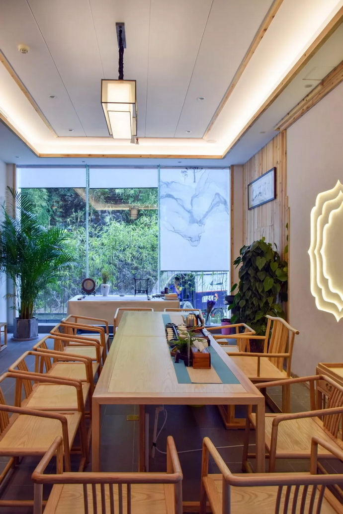 品茶体验区的设计,基本上以自然休闲为主,利用原木、石材类等天然材质装饰,地台、窗格等要素的使用很好地烘托出品茶的氛围,也避免了过度装修带来的有害物质,馆内随处点缀着一些盆景及绿植,增添了一份自然风韵,使人仿若置身山乡农舍、田间狂野,有回归大自然之感。
