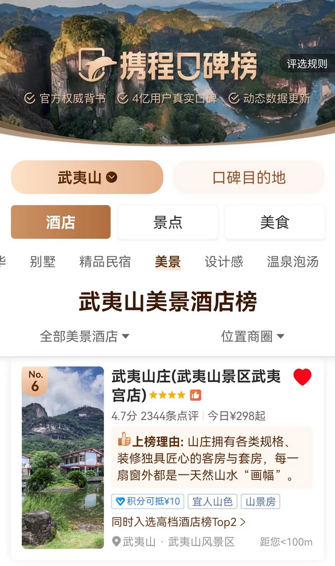 热烈祝贺武夷山庄荣登携程口碑榜“ 武夷山·美景酒店榜 ”